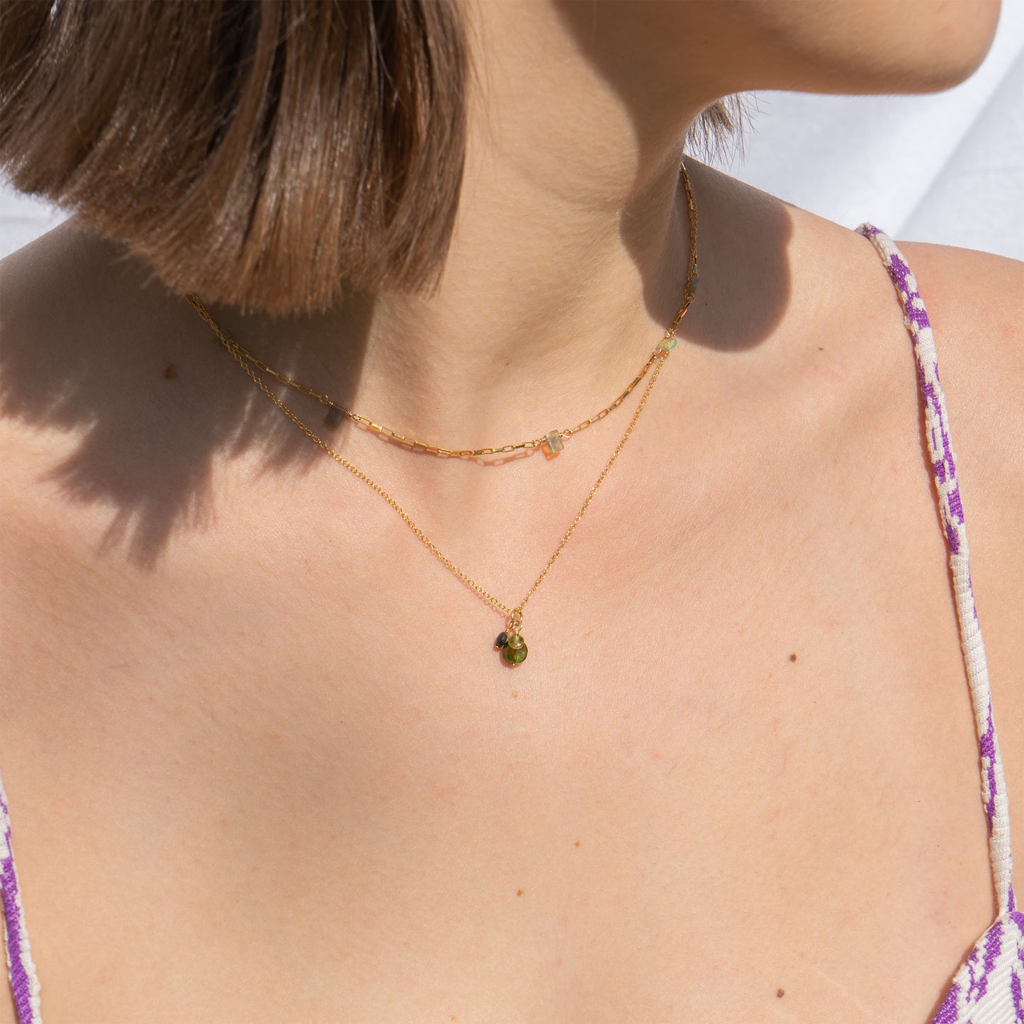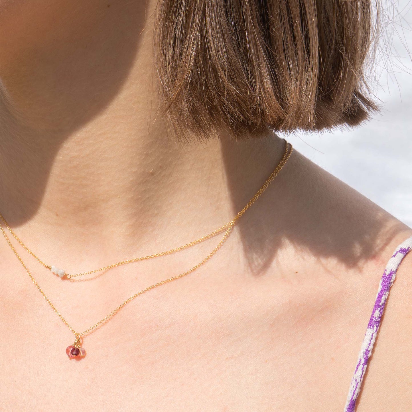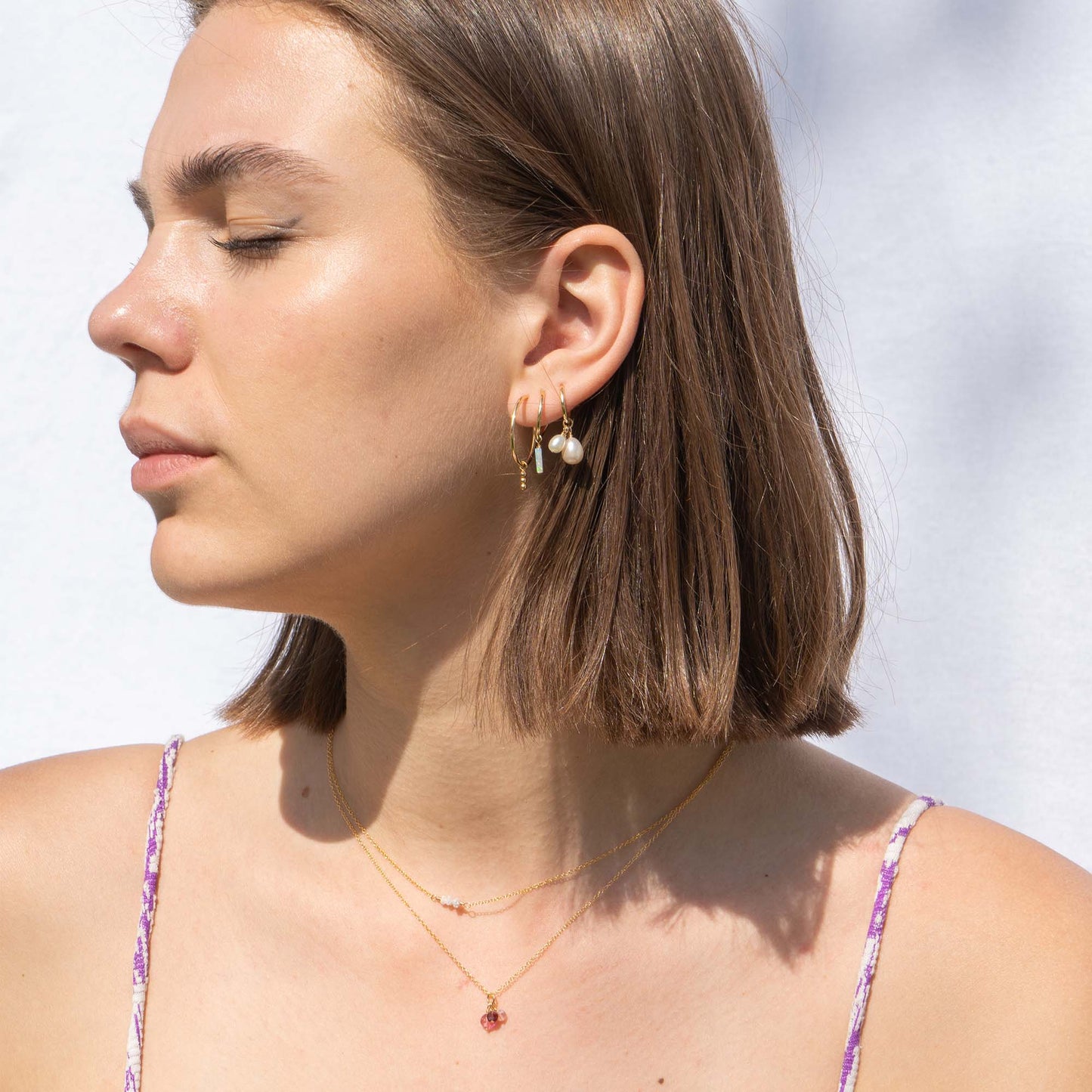 We exclusively use 14k gold filled, .925 sterling silver, and 5 micron vermeil gold. Perfect for everyday wear! All the gemstones & freshwater pearls we use are genuine. You can find detailed descriptions of all the materials we use and how to care for them here.