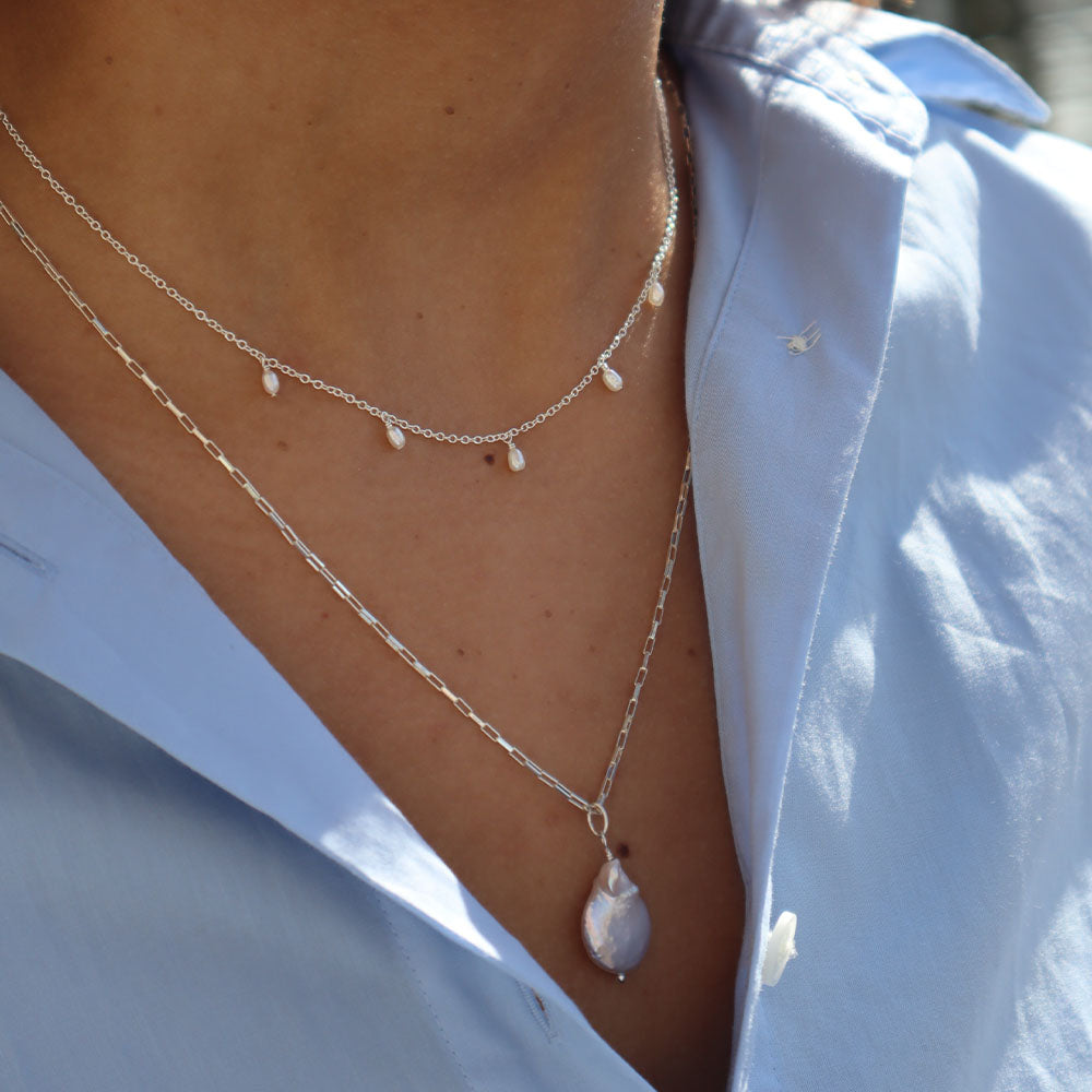 We exclusively use 14k gold filled, .925 sterling silver, and 5 micron vermeil gold. Perfect for everyday wear! All the gemstones & freshwater pearls we use are genuine. You can find detailed descriptions of all the materials we use and how to care for them here.