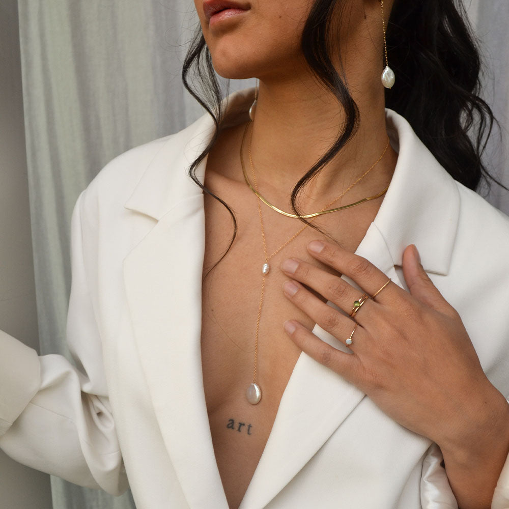 We exclusively use 14k gold filled, .925 sterling silver, and 5 micron vermeil gold. Perfect for everyday wear! All the gemstones & freshwater pearls we use are genuine. You can find detailed descriptions of all the materials we use and how to care for them here.