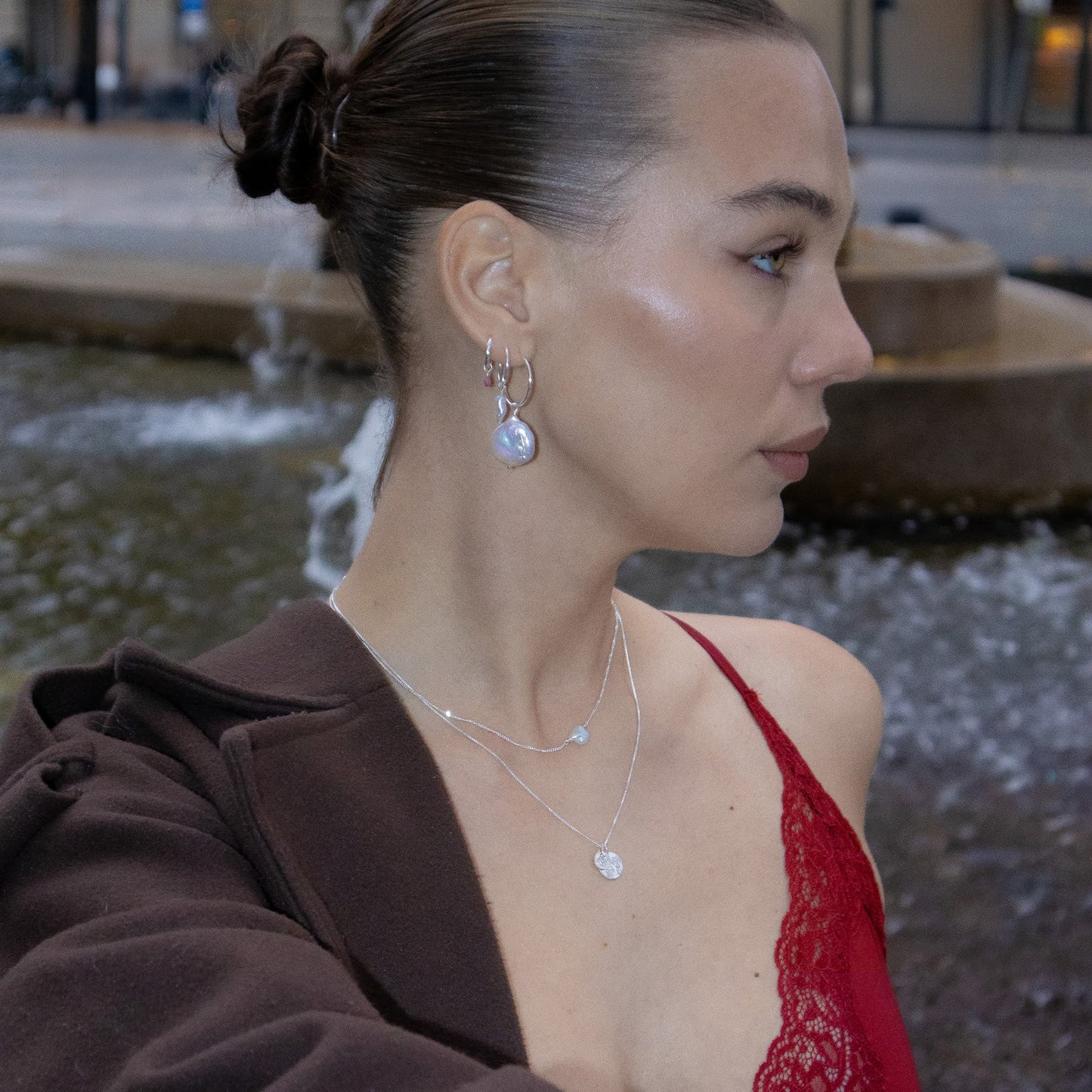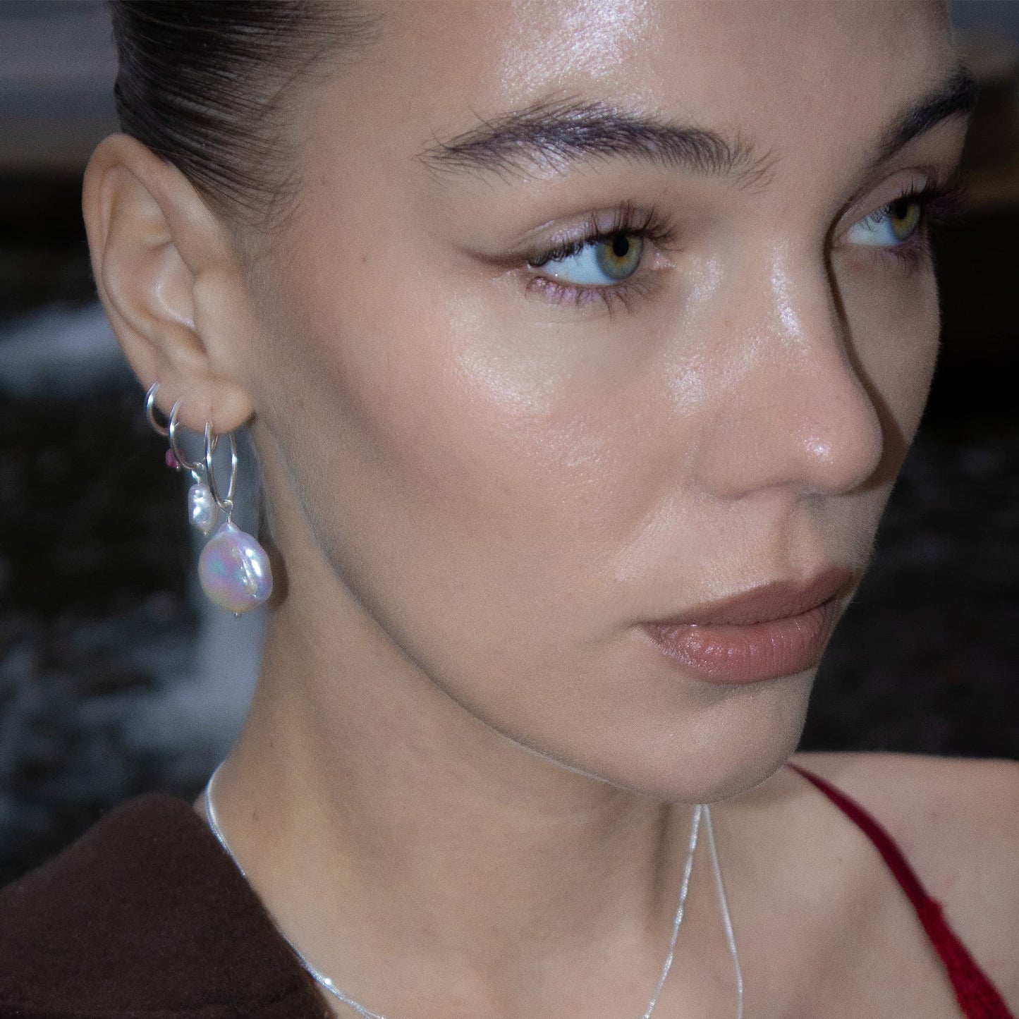 The Baroque pearl charm earring in silver balances classic elegance with a relaxed, organic feel. Unlike perfectly round pearls, these genuine baroque pearls feature irregular shapes and natural textures, meaning every single earring is a one-of-a-kind piece of art from nature.