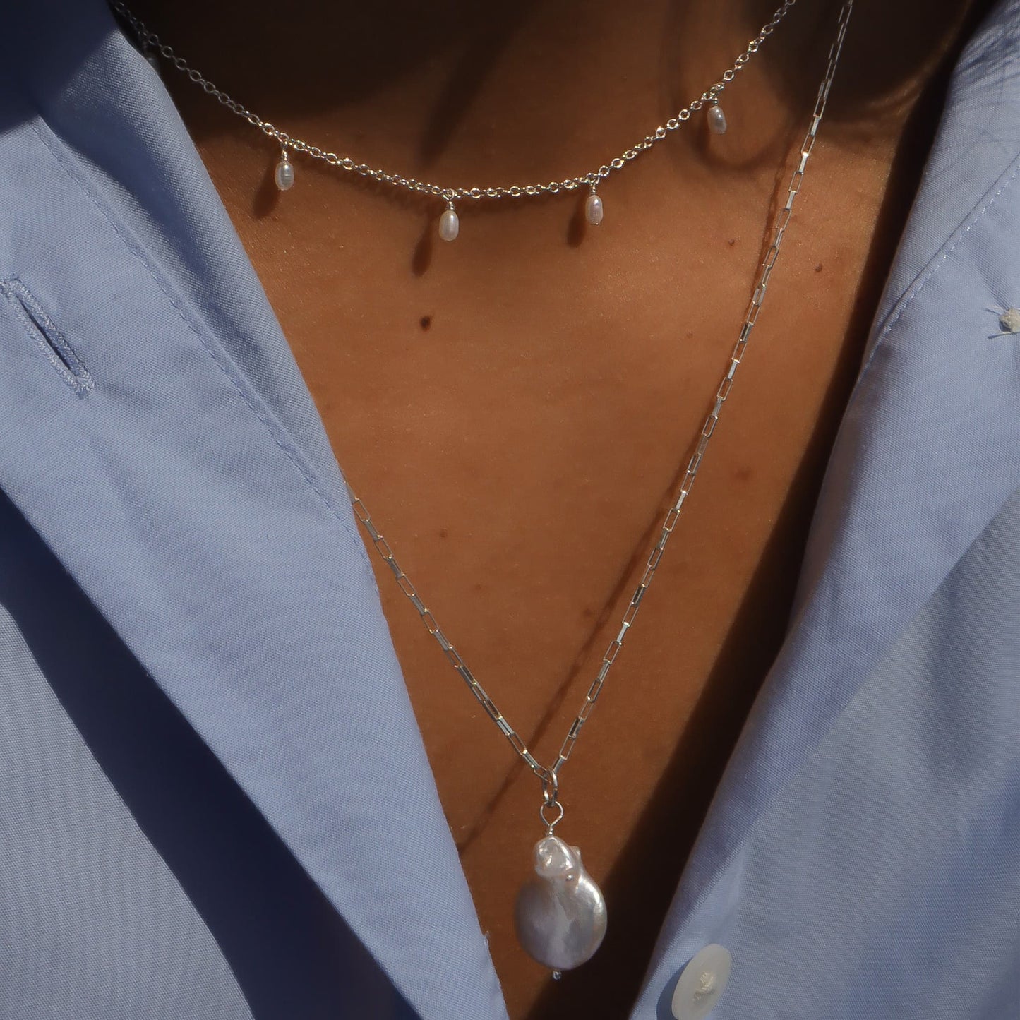 The lustrous white of the pearl creates a striking contrast against the bright, cool tone of the silver chain. Choose the Small size for a subtle, everyday shimmer, or go for the Large size to make a bold statement.