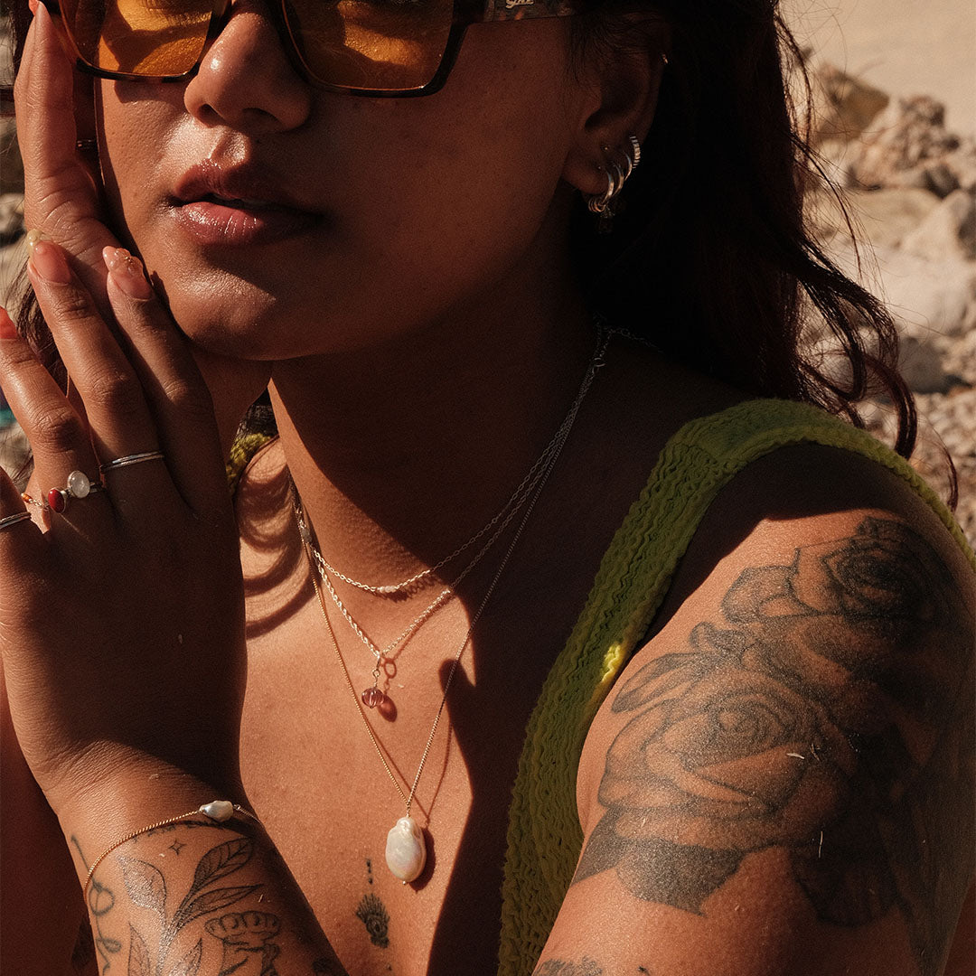 We exclusively use 14k gold filled, .925 sterling silver, and 5 micron vermeil gold. Perfect for everyday wear! All the gemstones & freshwater pearls we use are genuine. You can find detailed descriptions of all the materials we use and how to care for them here.