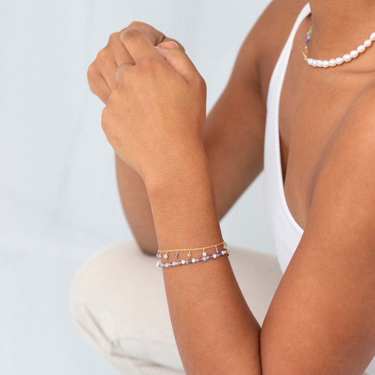 We exclusively use 14k gold filled, .925 sterling silver, and 5 micron vermeil gold. Perfect for everyday wear! All the gemstones & freshwater pearls we use are genuine. You can find detailed descriptions of all the materials we use and how to care for them here.