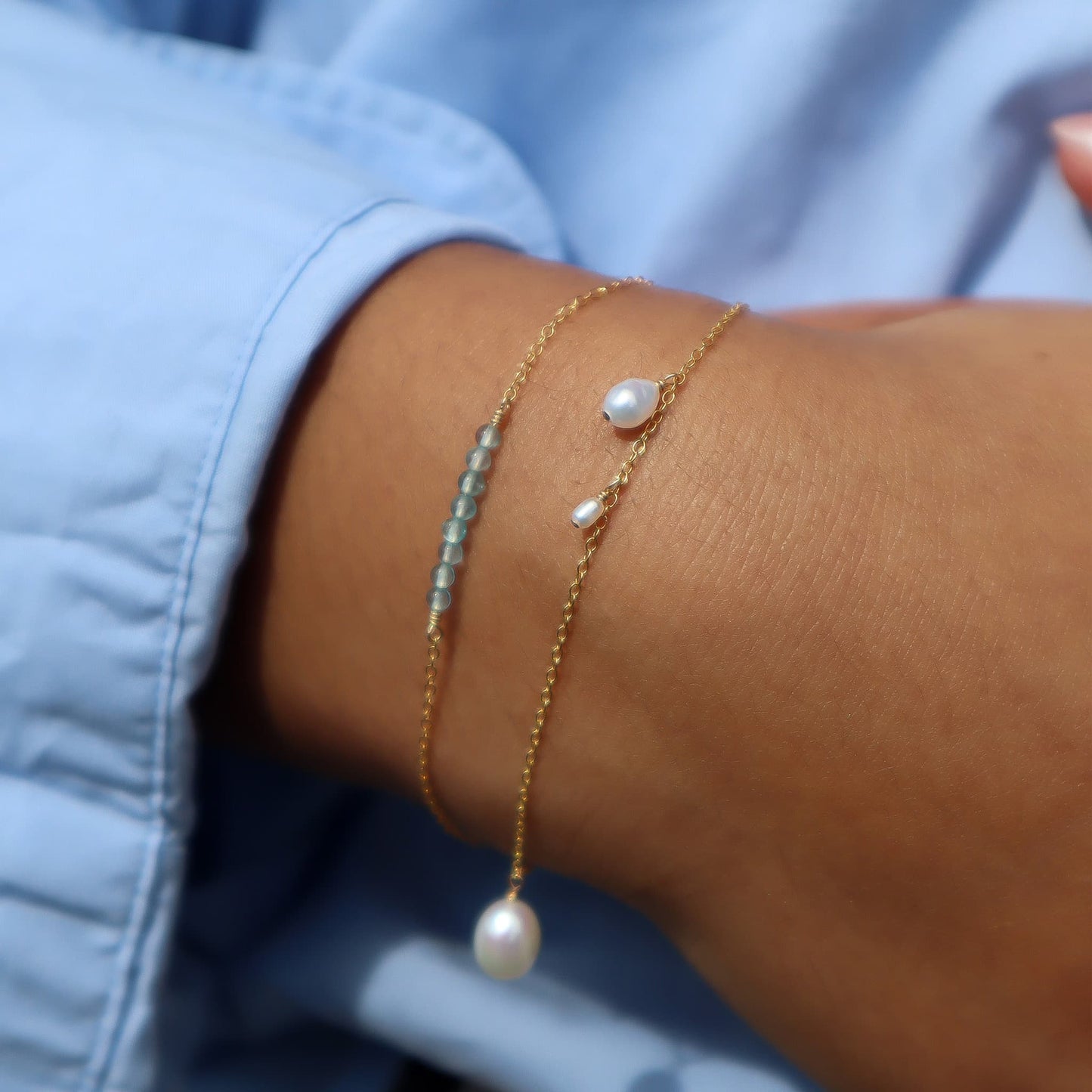De Asymmetric Pearl armband heeft echte zoetwaterparels die asymmetrisch op een fijne gouden ketting zijn geplaatst. Deze onverwachte plaatsing geeft de klassieke parelarmband een moderne, artistieke update die fris en hedendaags aanvoelt.