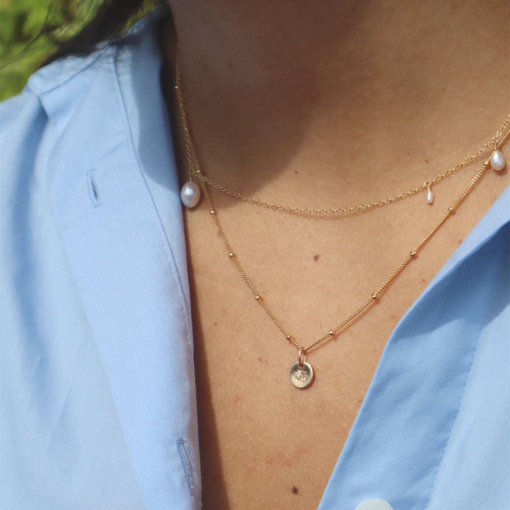 We werken exclusief met 14k gold filled, .925 sterling zilver en 5 micron vermeil goud voor onze sieraden. Perfect om elke dag te dragen en om te houden! Alle parels en edelstenen die we gebruiken zijn echt. Als je meer wil weten over de materialen die we gebruiken en hoe je er het best voor kan zorgen, klik dan hier.